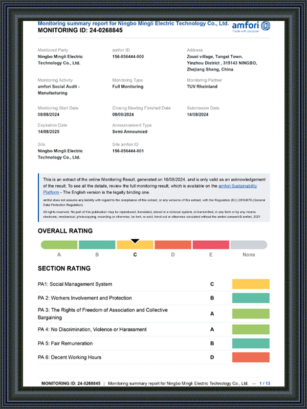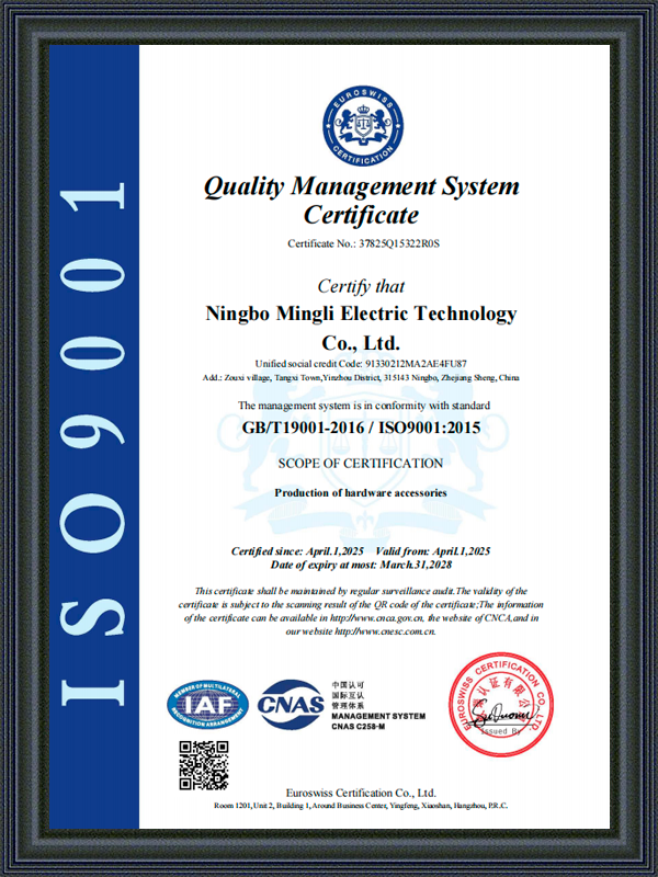 A termék -tétel kézbesítése előtt a Ningbo Mingli Electric Technology Co., Ltd. végső dimenzió -ellenőrzést is elvégez annak biztosítása érdekében, hogy minden egyes termékcsoport megfeleljen az ügyfél konkrét követelményeinek. Ez a link a dimenziók konzisztenciájának további biztosítása az első és az utolsó termék között, elkerülve a szállítás és a tömegtermelés hibáit.